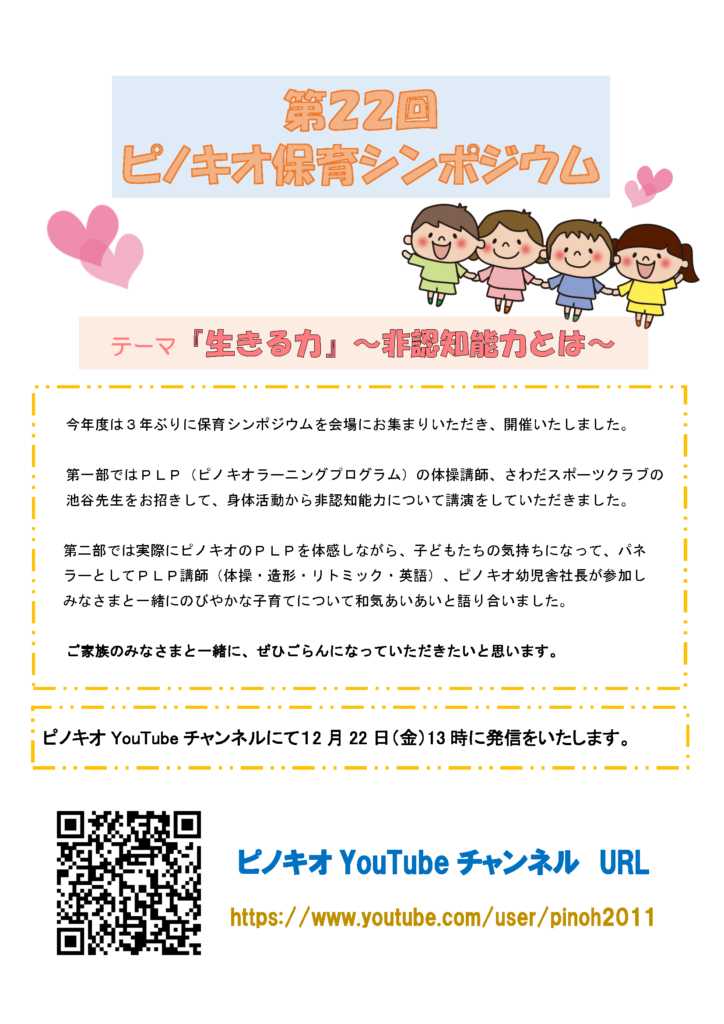 コーポレート 2023.12.22 第22回ピノキオ保育シンポジウム Youtube公開しました! テーマ「生きる力」~非認知能力とは~ その他子育て支援行事・イベント 第22回ピノキオ保育シンポジウム ダウンロード 記事一覧へ