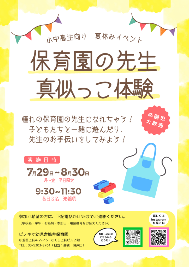 小中高生向け夏休みイベントとして、「保育園の先生真似っこ体験」を開催します。