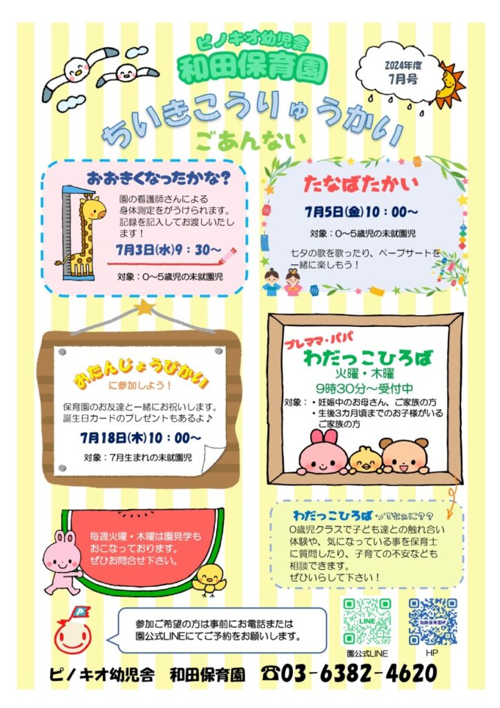 和田保育園 2024.06.28 7月 地域交流のお知らせ 地域交流 ピノキオ幼児舎和田保育園では、未就園のお子さま・ご家族にご参加頂ける行事やイベントを開催しています。赤ちゃんを迎えたご家庭、プレパパさん、プレママさん向けの「わだっこひろば」も定期開催中。参加のご希望、お問い合わせは園公式LINEで随時受付中です! LINE友だち追加はこちら皆さんお誘いあわせの上、お気軽にご参加・お問い合わせください。お待ちしています! 記事一覧へ