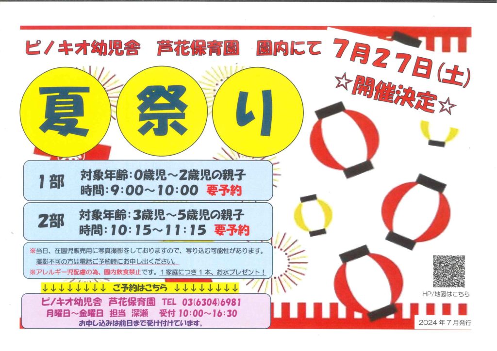 芦花保育園 2024.07.08 夏祭り 地域交流行事・イベント 7月27日 土曜日 ☆9時~10時 0歳児~2歳児の親子 ☆10時15分~11時15分 3歳児~5歳児の親子 安全対策の為、ご予約をいただいております。お電話にてご連絡ください。 記事一覧へ