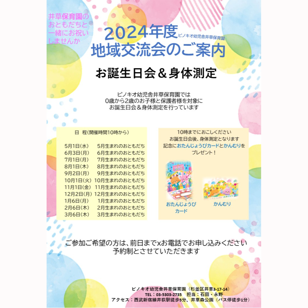 ピノキオ幼児舎井草保育園では、毎月1日に0歳~2歳のお子様のお誕生日会と身体測定を実施しています。