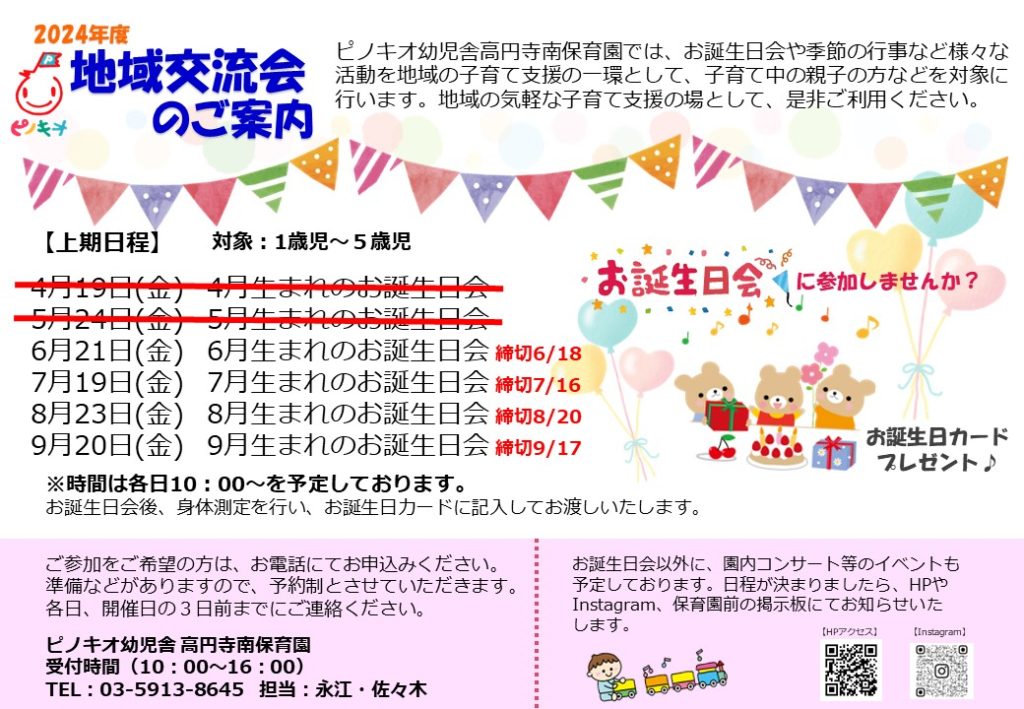 ピノキオ幼児舎 高円寺南保育園では、お誕生日会や季節の行事など、様々な活動を地域の子育て支援の一環として、子育て中の親子の方などを対象に行います。